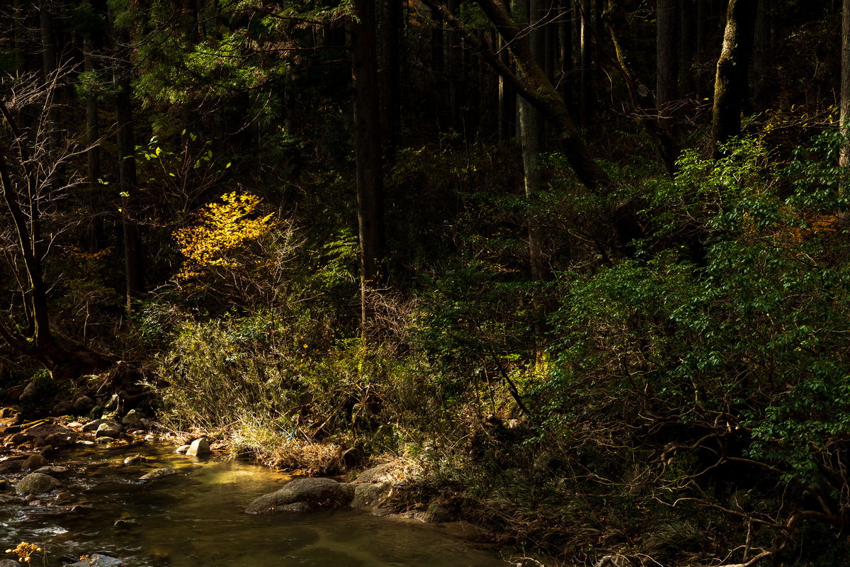 こちらの写真ですが、黄色く紅葉した木にスポットライトのように光が当たってました。